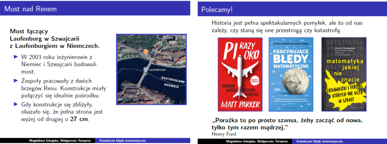 W prezentacji pojawiły się zarówno zabawne przykłady, jak interpretacja zapisu „2 + 2 = 11” w innym systemie liczbowym, jak i znacznie poważniejsze historie, od sondy Mars Climate Orbiter, która spaliła się w atmosferze planety z powodu pomylenia jednostek metrycznych i imperialnych, po inżynierskie wpadki: kołyszące się mosty oraz konstrukcje, które… minęły się prawie o pół metra.